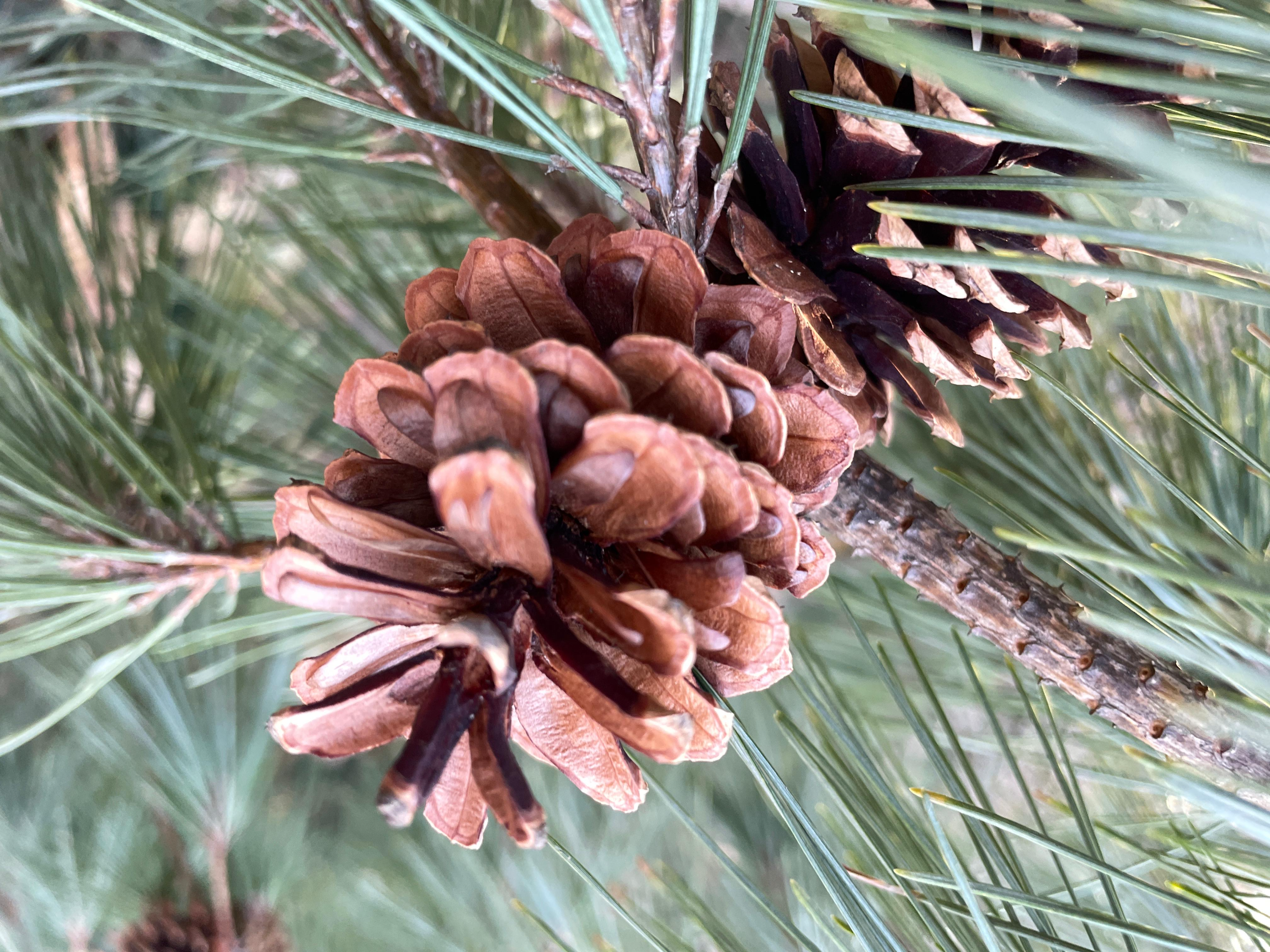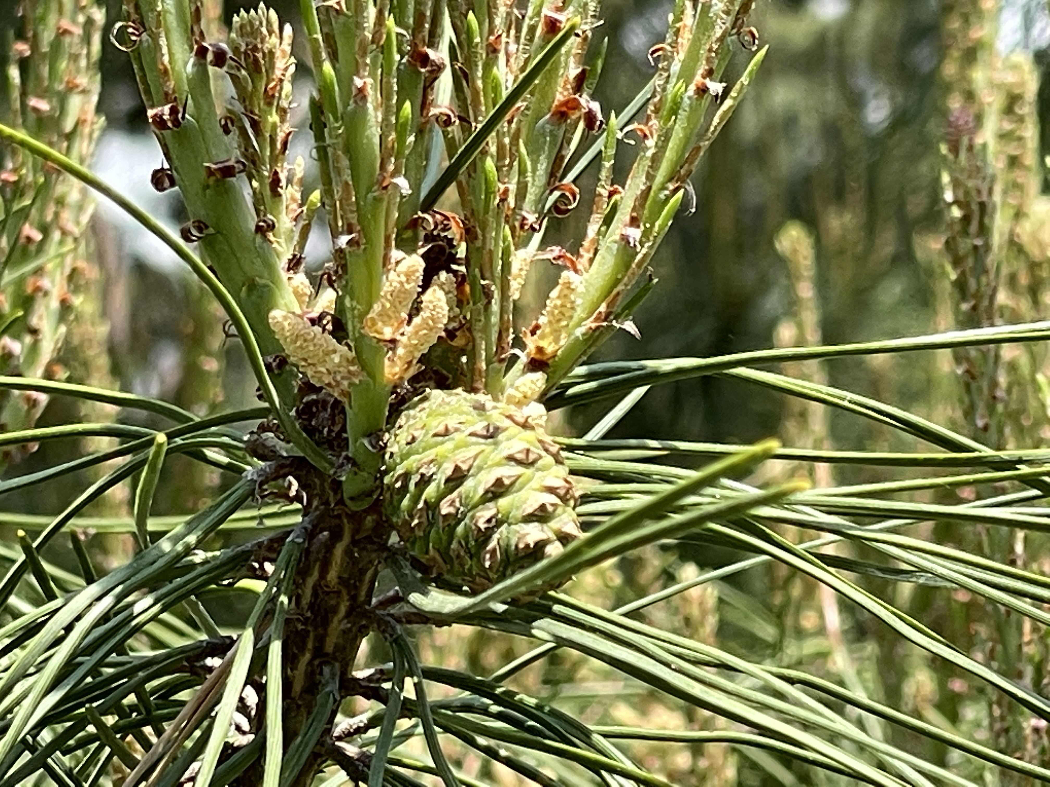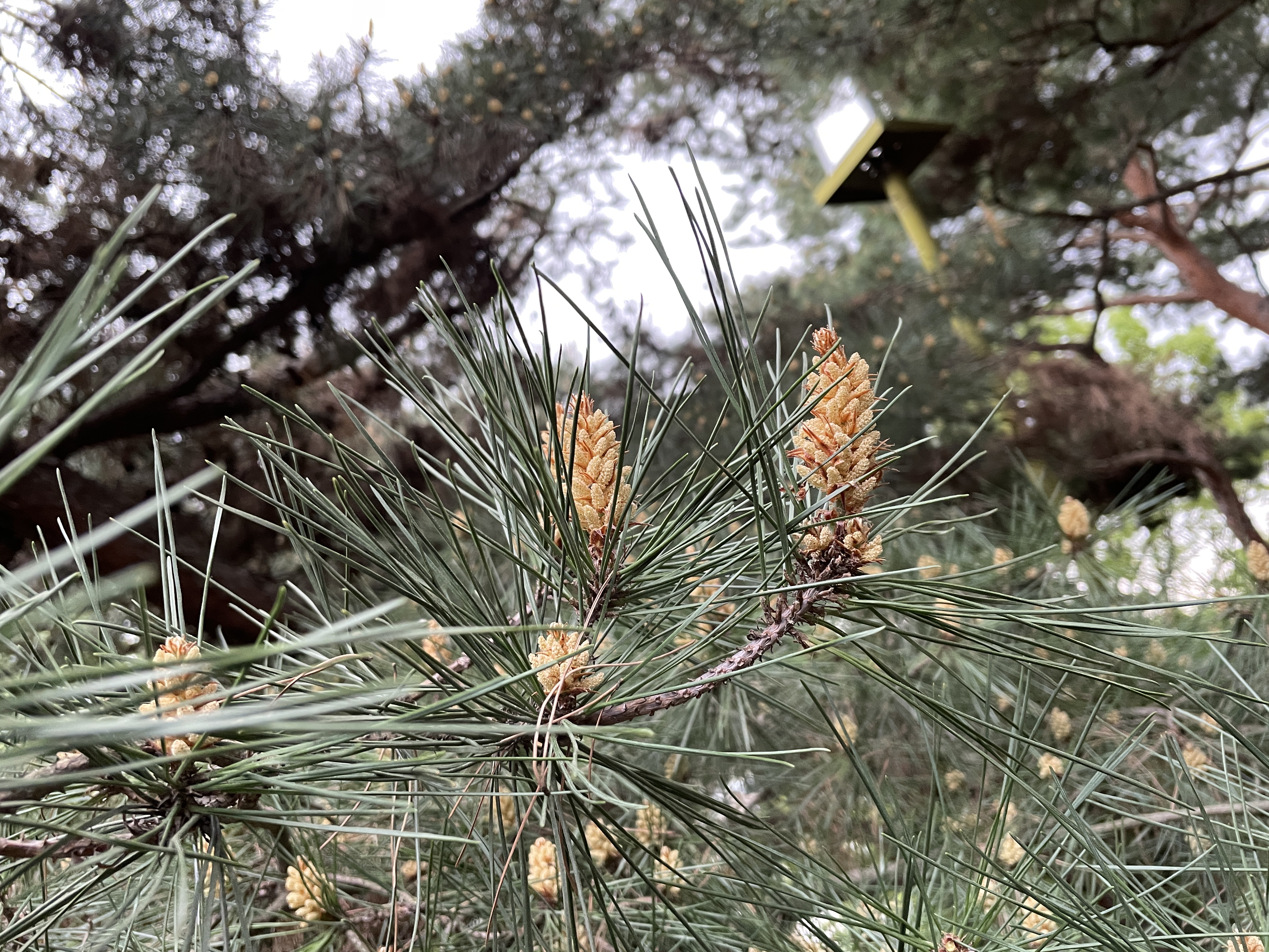 소나무꽃은 5월에 핍니다. 우리는 흔히 노란 송화를 보고 소나무의 꽃이라고 생각하는데요. 새로 생긴 가지의 끝에 노란 큰 꽃은 수꽃이고 수꽃은 밑에 생깁니다. 암꽃은 윗부분에 새로 생긴 가지에 조그만 보랏빛을 틔는 꽃을 암꽃이라고 합니다.