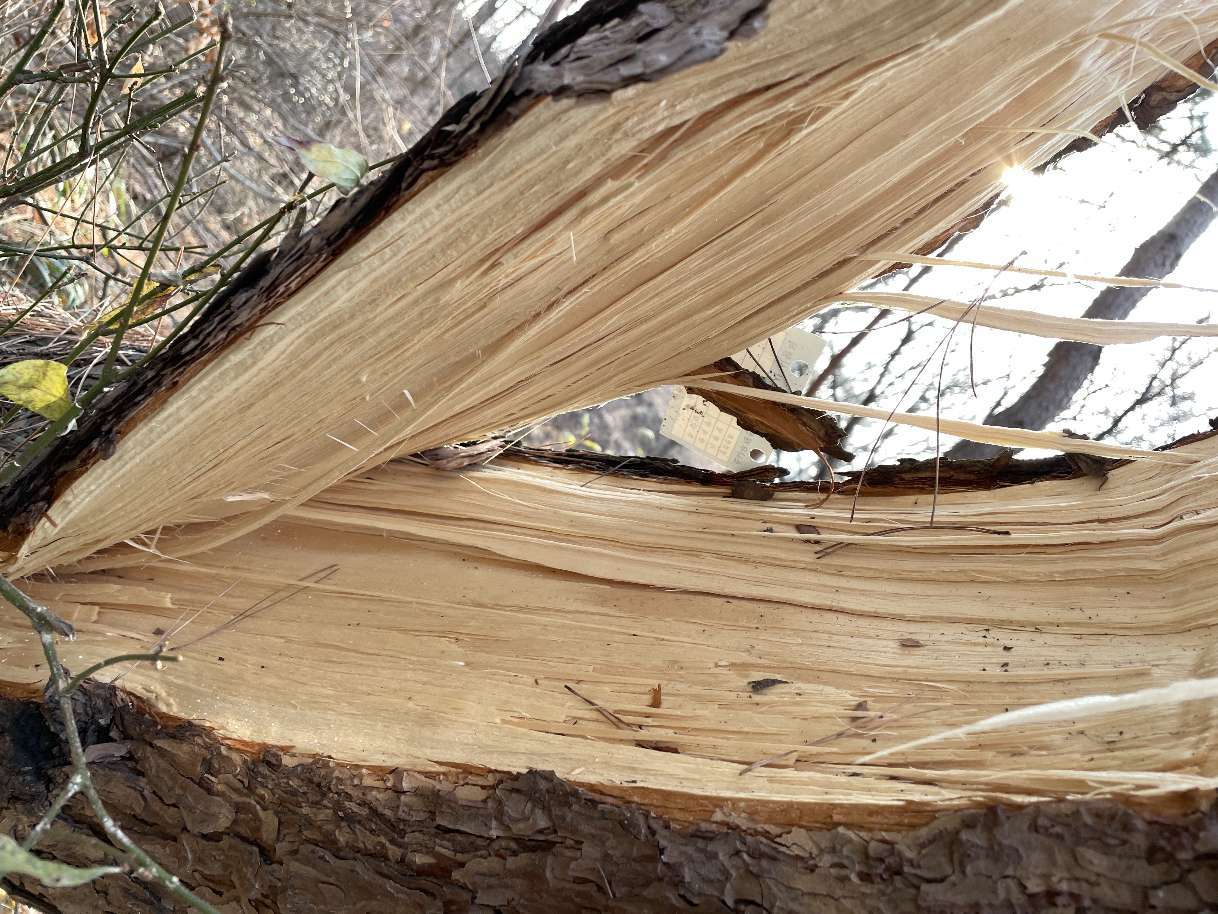 이 소나무도 폭설로 가지가 찢어진 것인데요. 세로로 갈라진 모습입니다. 소나무의 속을 만져봤는데 매우 딱딱한 했어요.
