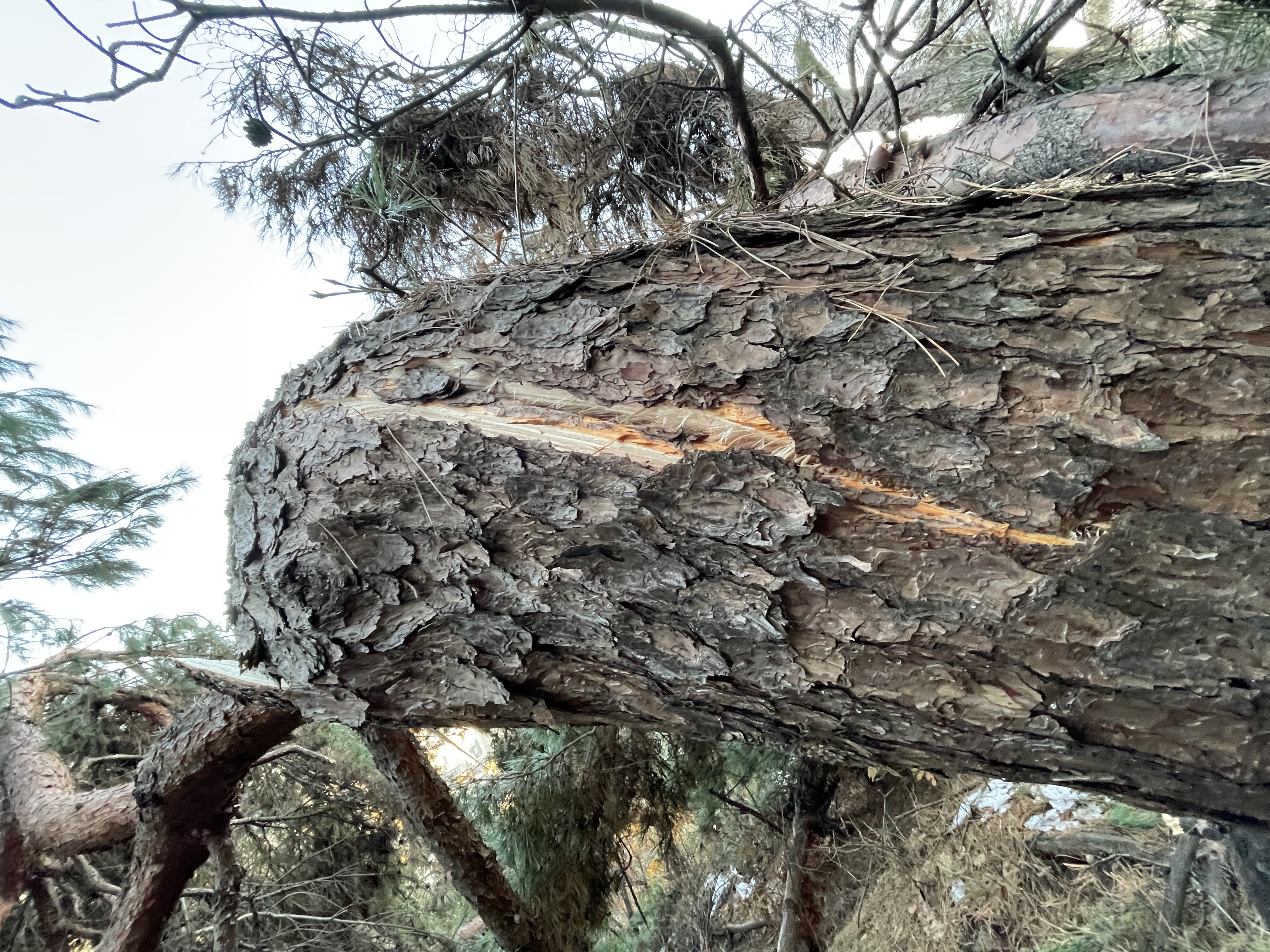소나무가 쓰러졌는데 부러지거나 꺾기지 않아서 자세히 관찰해 봤는데 소나무가 뒤틀린 상처가 보였습니다.