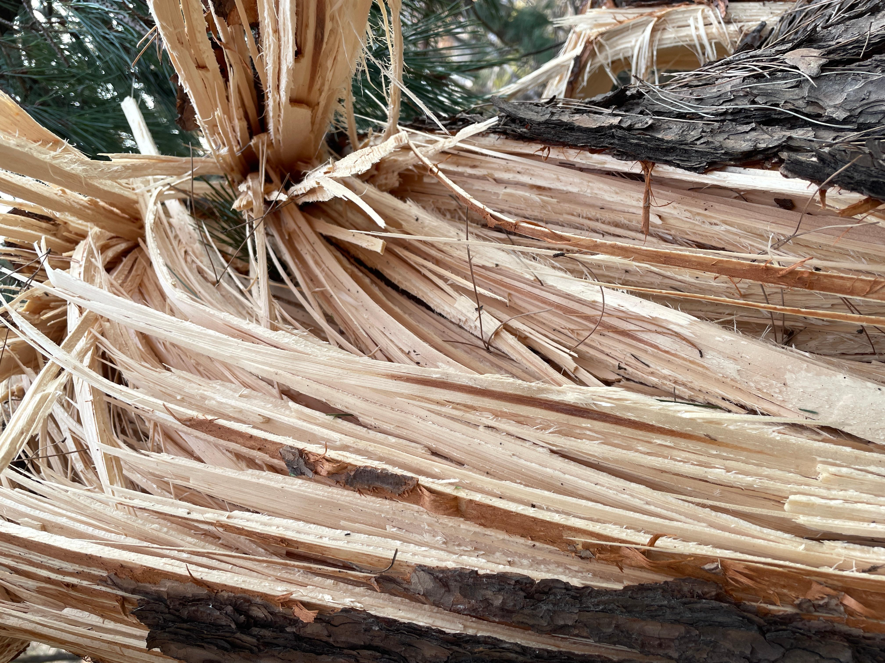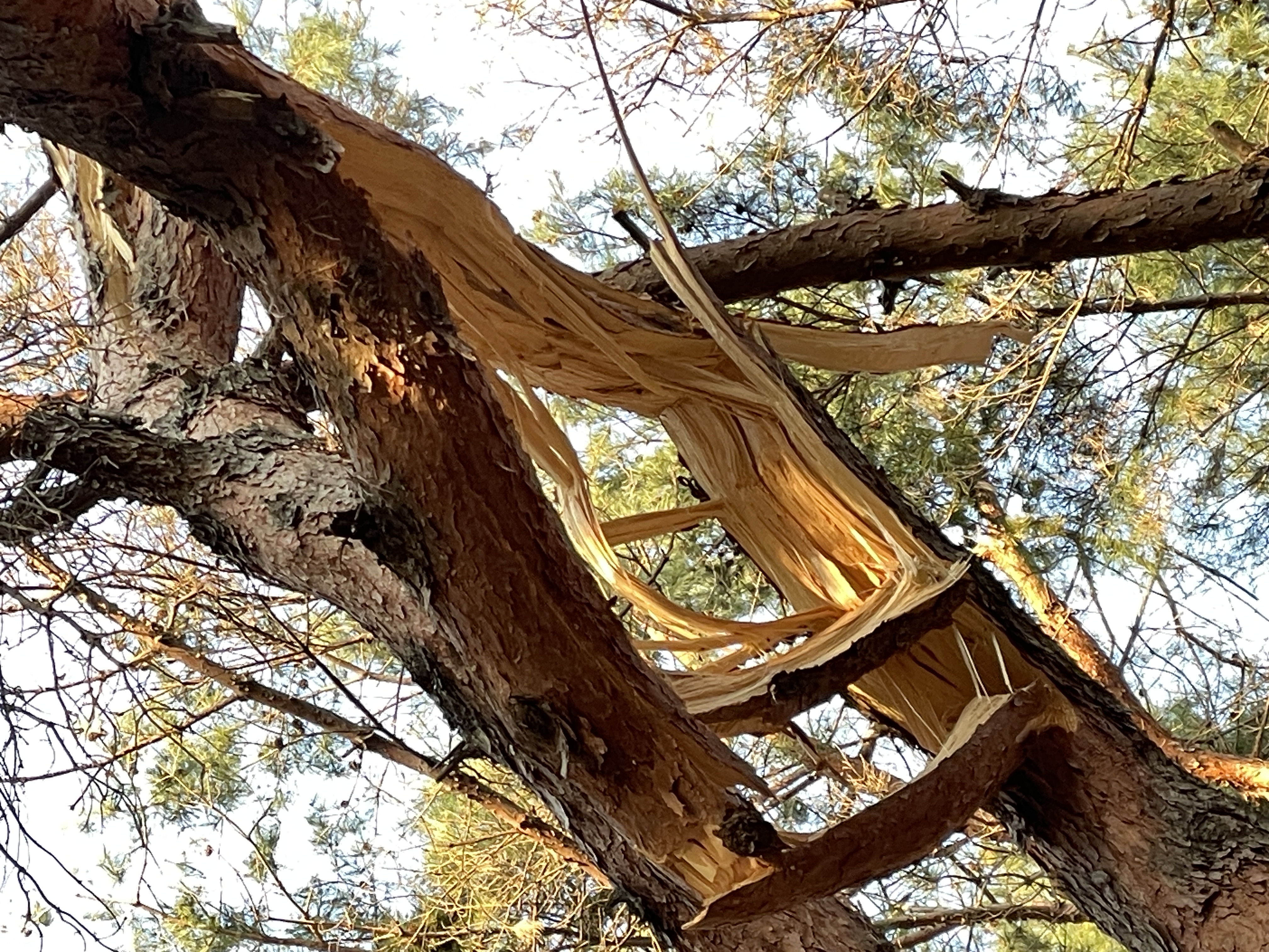 소나무가 무거운 눈을 이겨보려고 몸부림친 흔적이 소나무를 갈기갈기 찢어지게 만들었습니다.