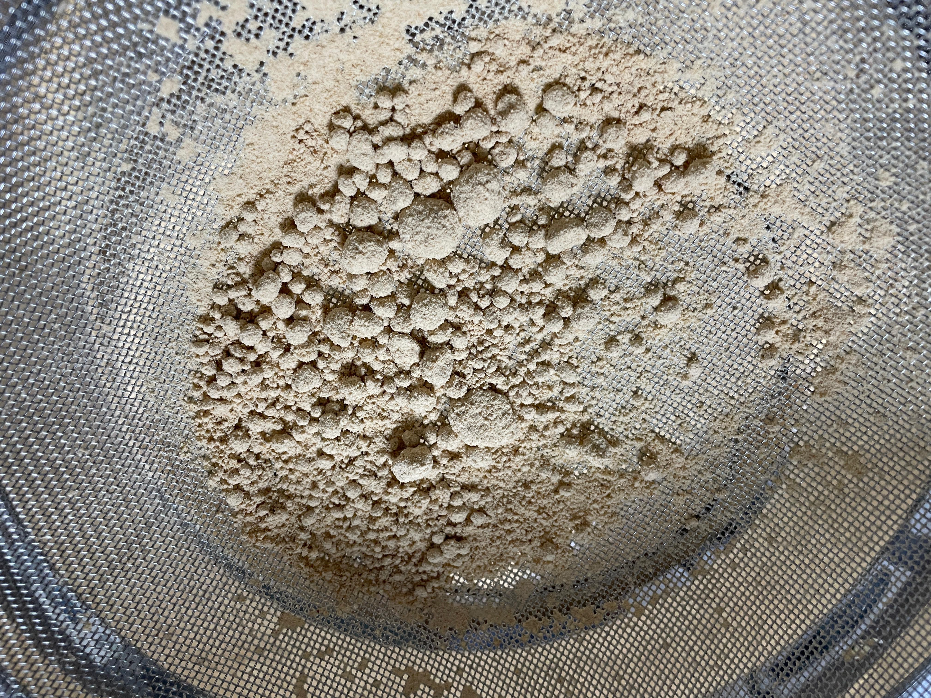 7. 식은 국물에 메주가루를 채에 쳐서 곱게내리고 뭉치지 않게 저어줍니다.