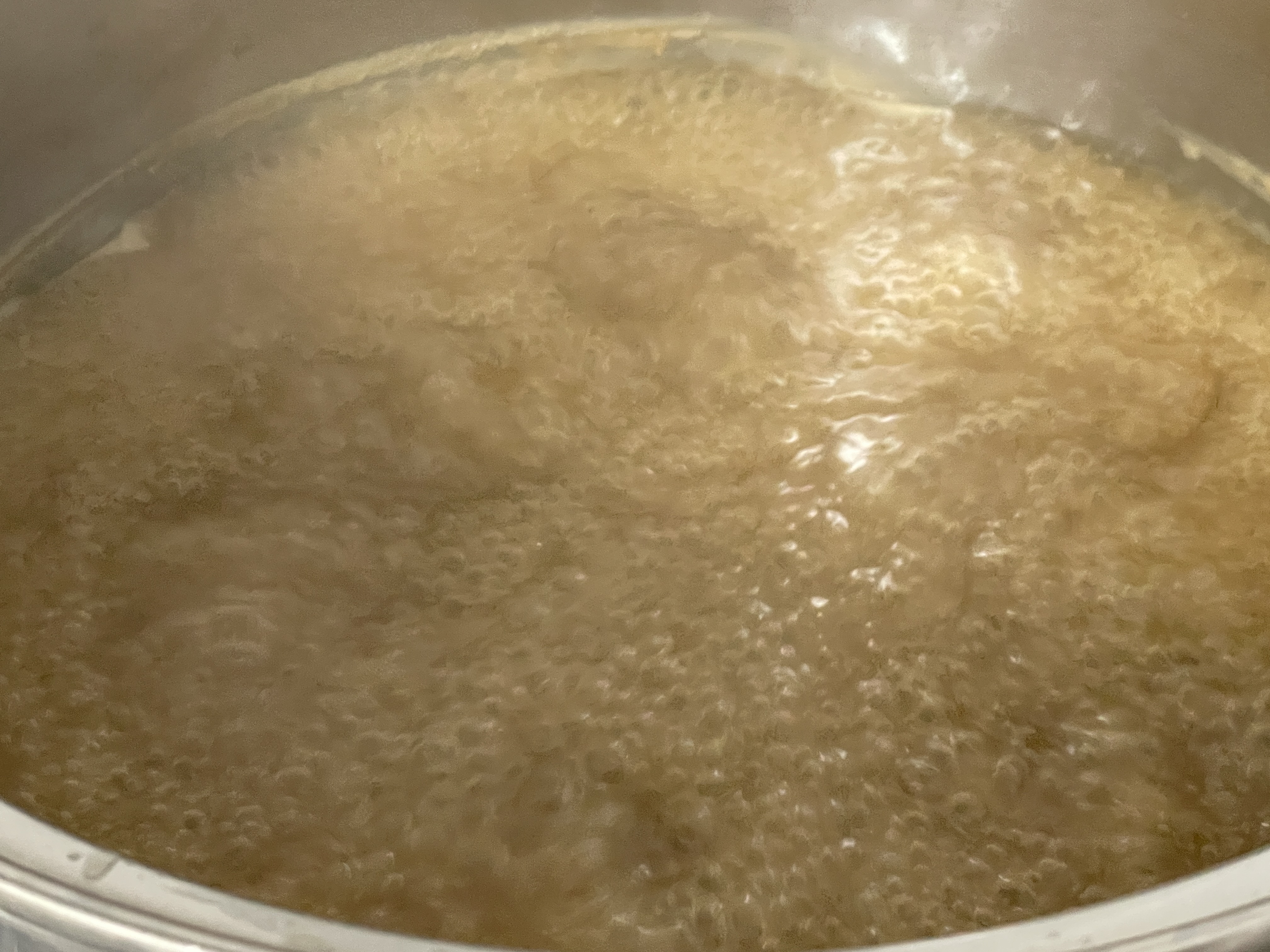 5. 찹쌀밥이 잘 삭었을 때 남은 엿기름 물을 섞은 다음 강불에서 한 소금 끓인 후 면포로 꼭 짜줍니다.