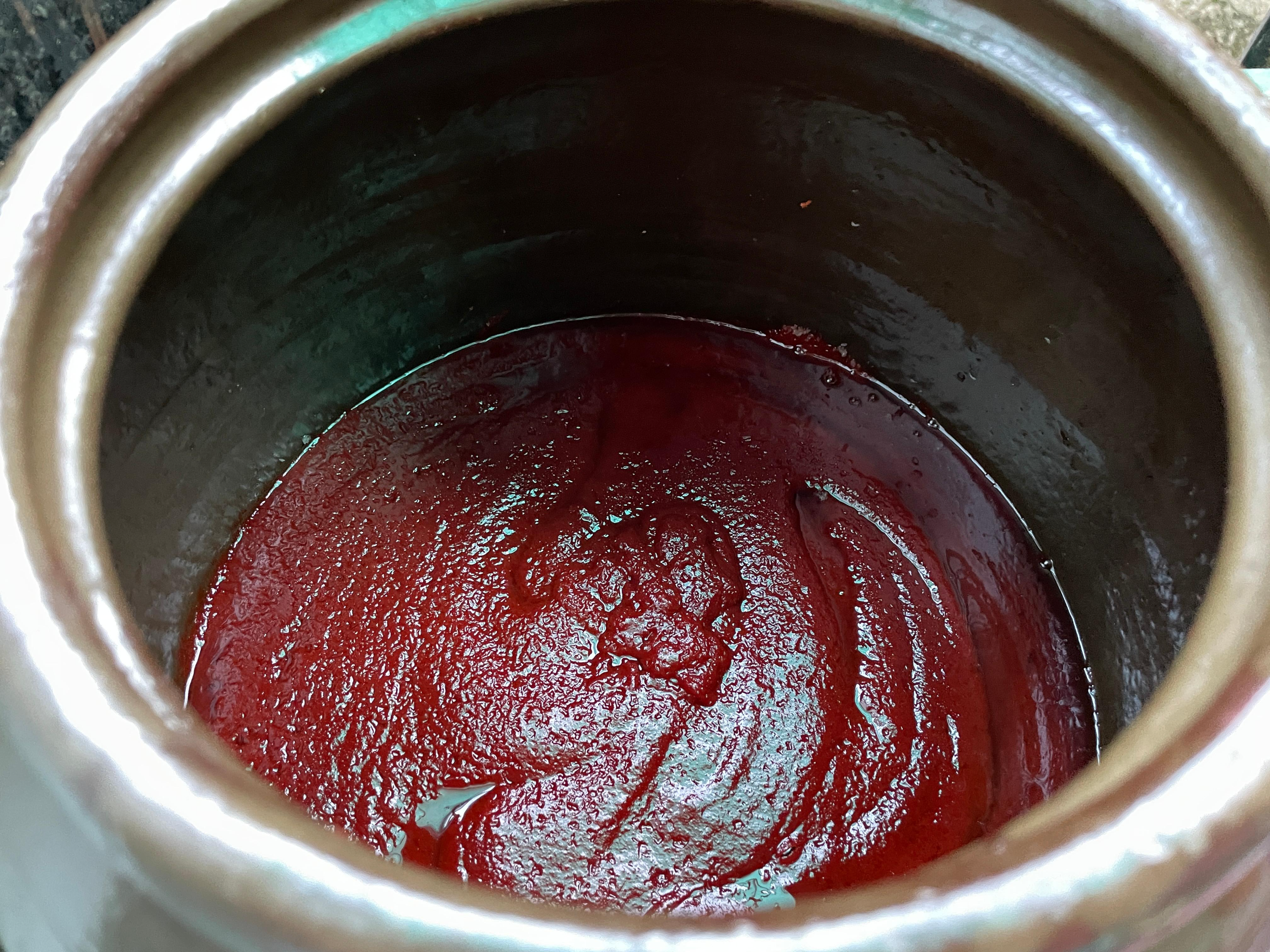 ● 통에 물기가 마르면 마늘고추장을 넣어줍니다.
