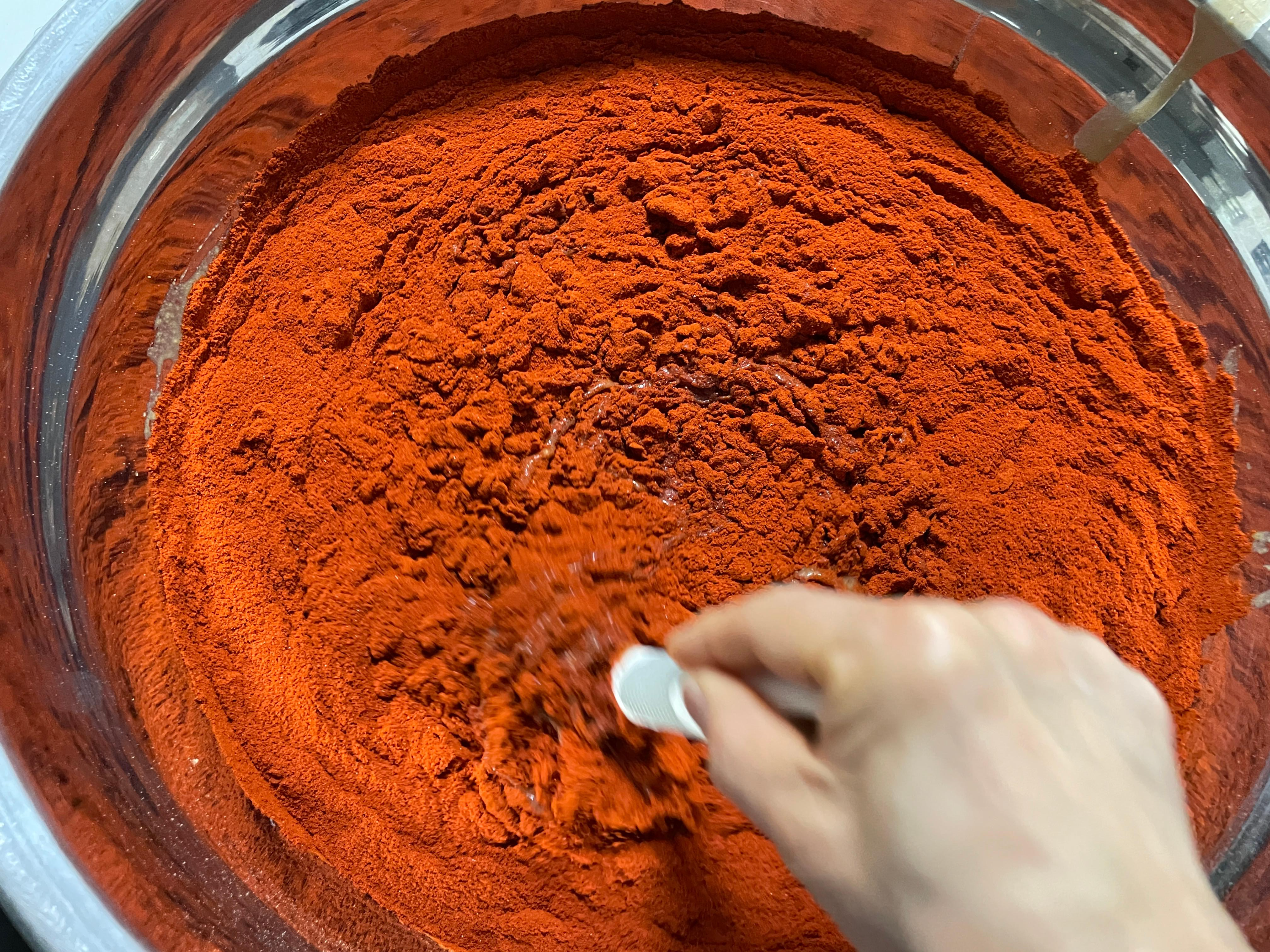 8. 고춧가루도 채에 쳐서 뭉치지 않게 잘 저어줍니다.