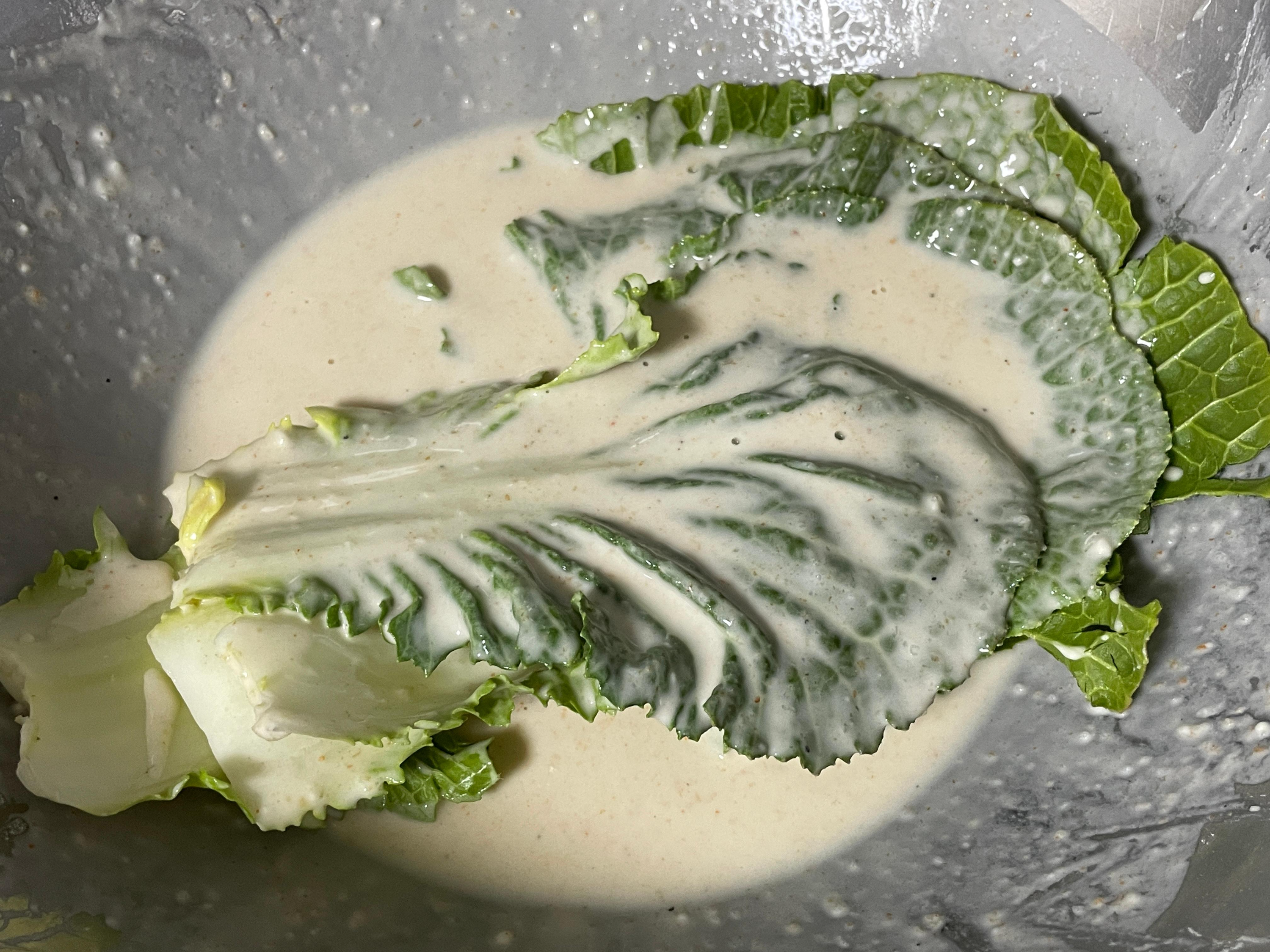 4. 봄동에 반죽을 골고루 살짝 묻혀줍니다. 배추 전은 피가 두꺼우면 맛이 없어요.