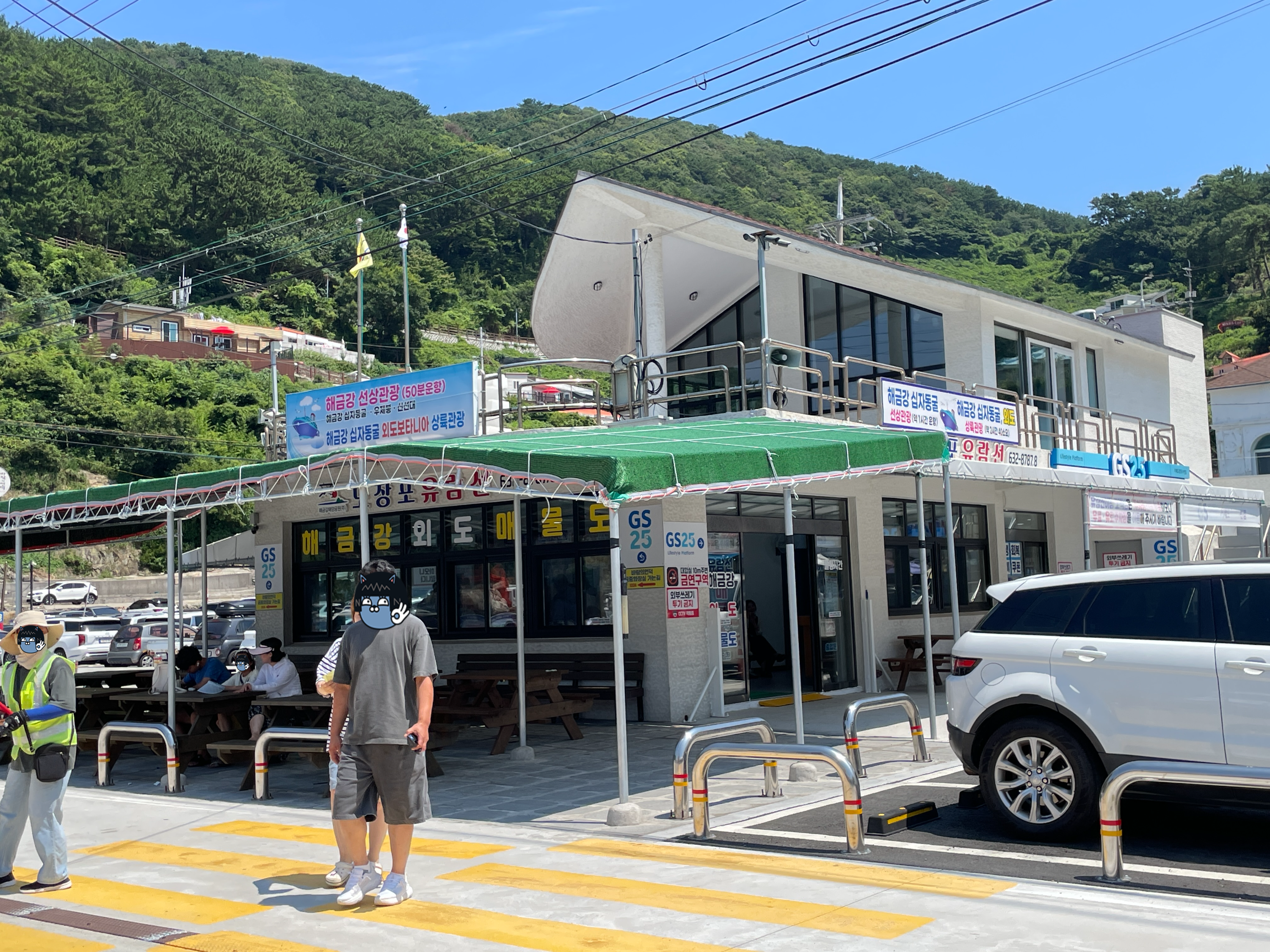 많은 사람들은 멋진 해금강의 풍경과 바닷물의 색을 보며 넉을 잃고 있어요.