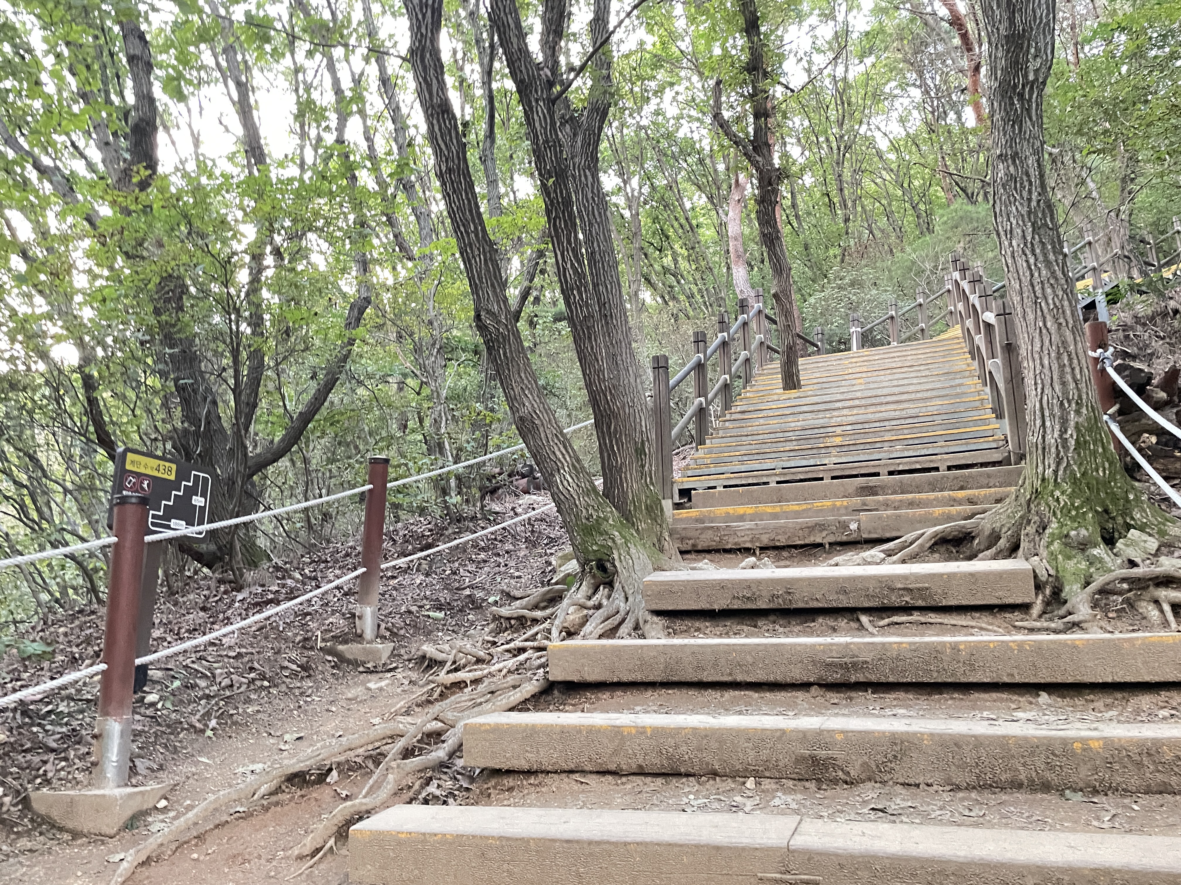 올라오면서 문암골이정표가 보이고 쭉올라오면 계단이 나옵니다. 계단옆에 표지판에 계단이 438개 라고 적혀 있습니다. 아파트 27층정도의 계단이데 주변경관이 좋아 쉽게 오릅니다.