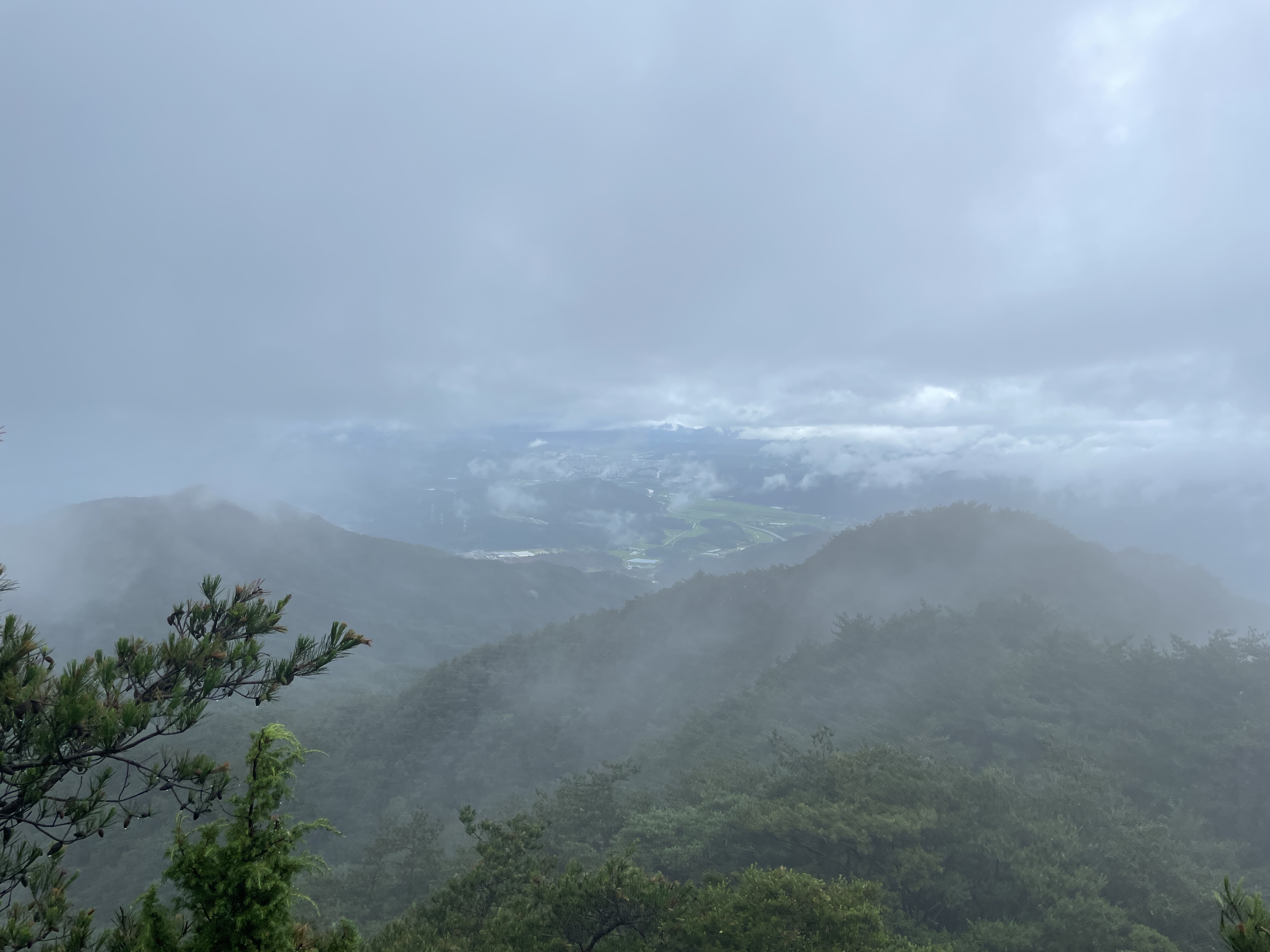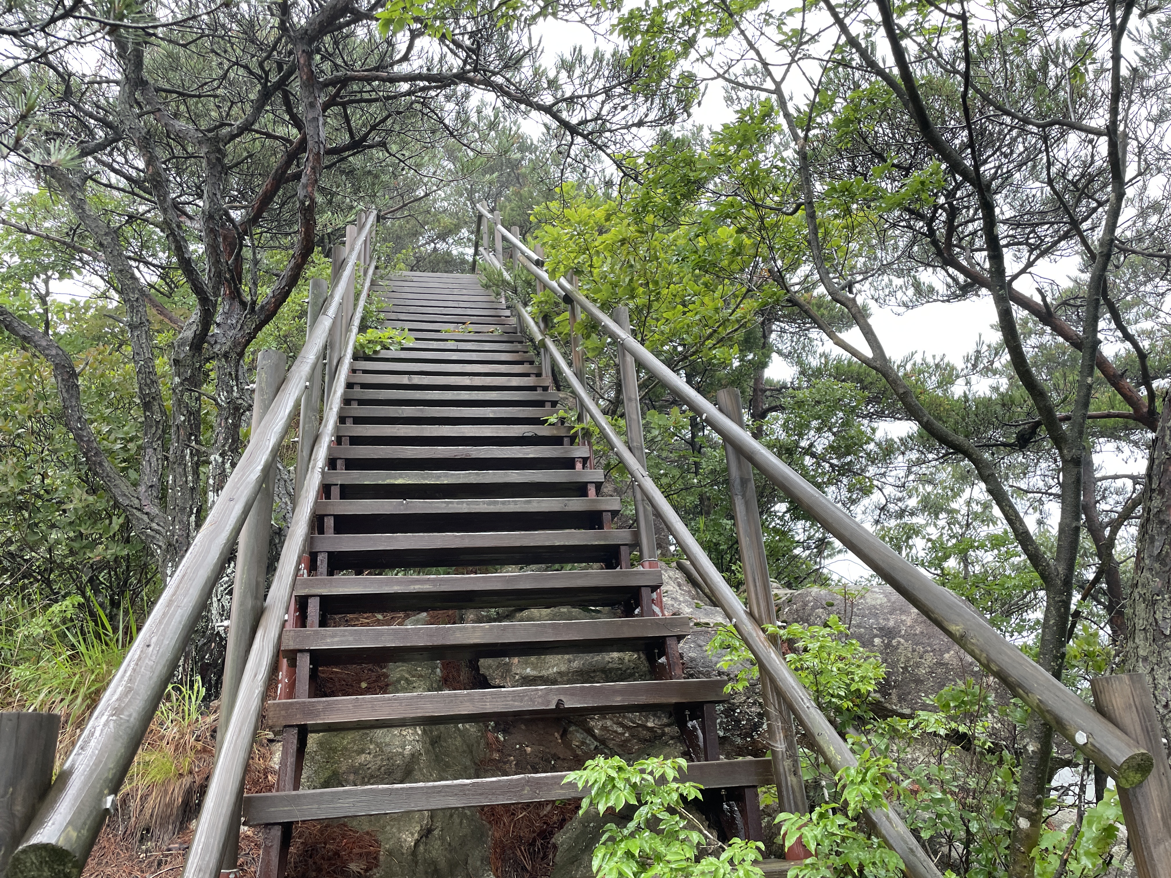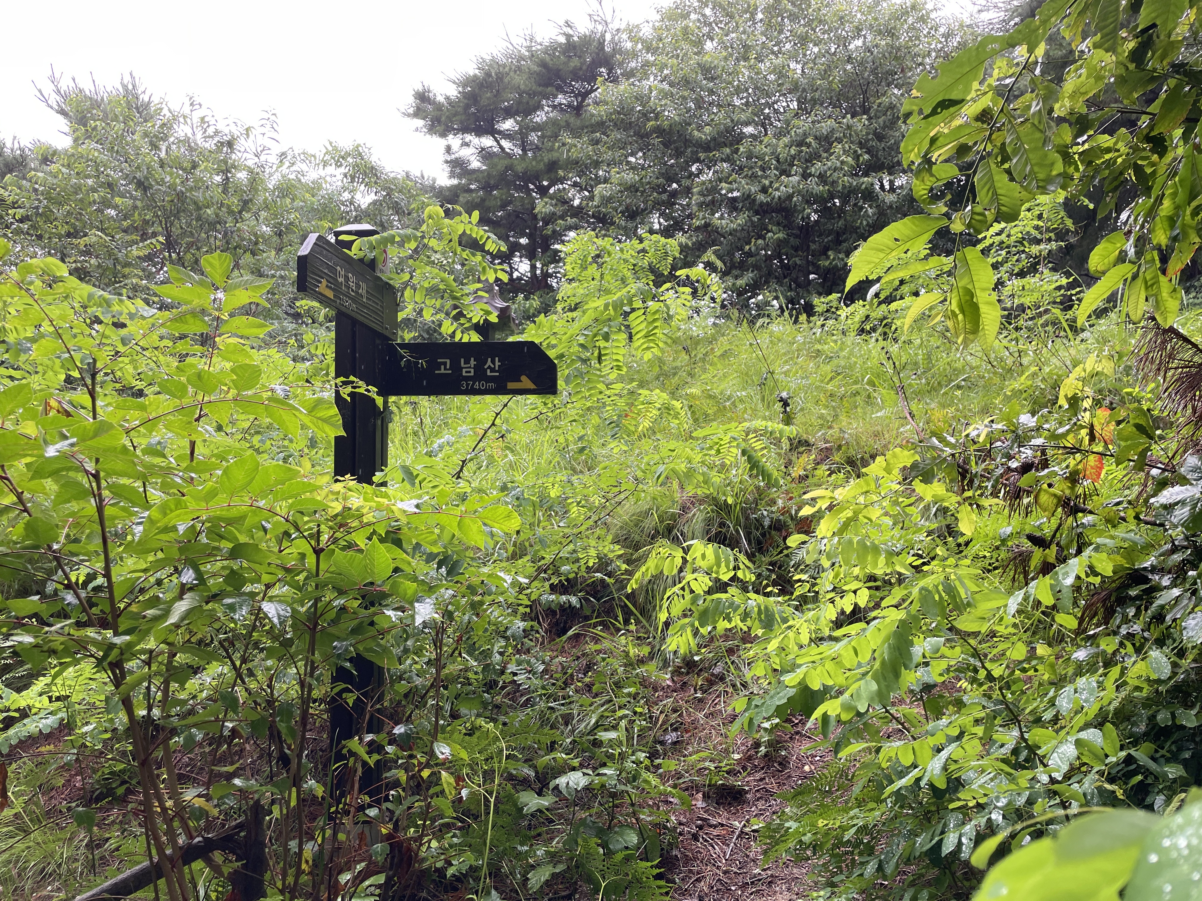 계단을 올라와서 뒤를 돌아보았을 때 풍경, 길을 걷는 동안 천둥번개는 우르르 쾅쾅, 번쩍번쩍 심하게 많이 쳤는데 우리가 가는 백두대간길에는 우비를 벗어도 될 정도의 가끔 나무에서 떨어지듯 내려서 길은 질척였지만 산행을 하는데 불편하지 않았다.