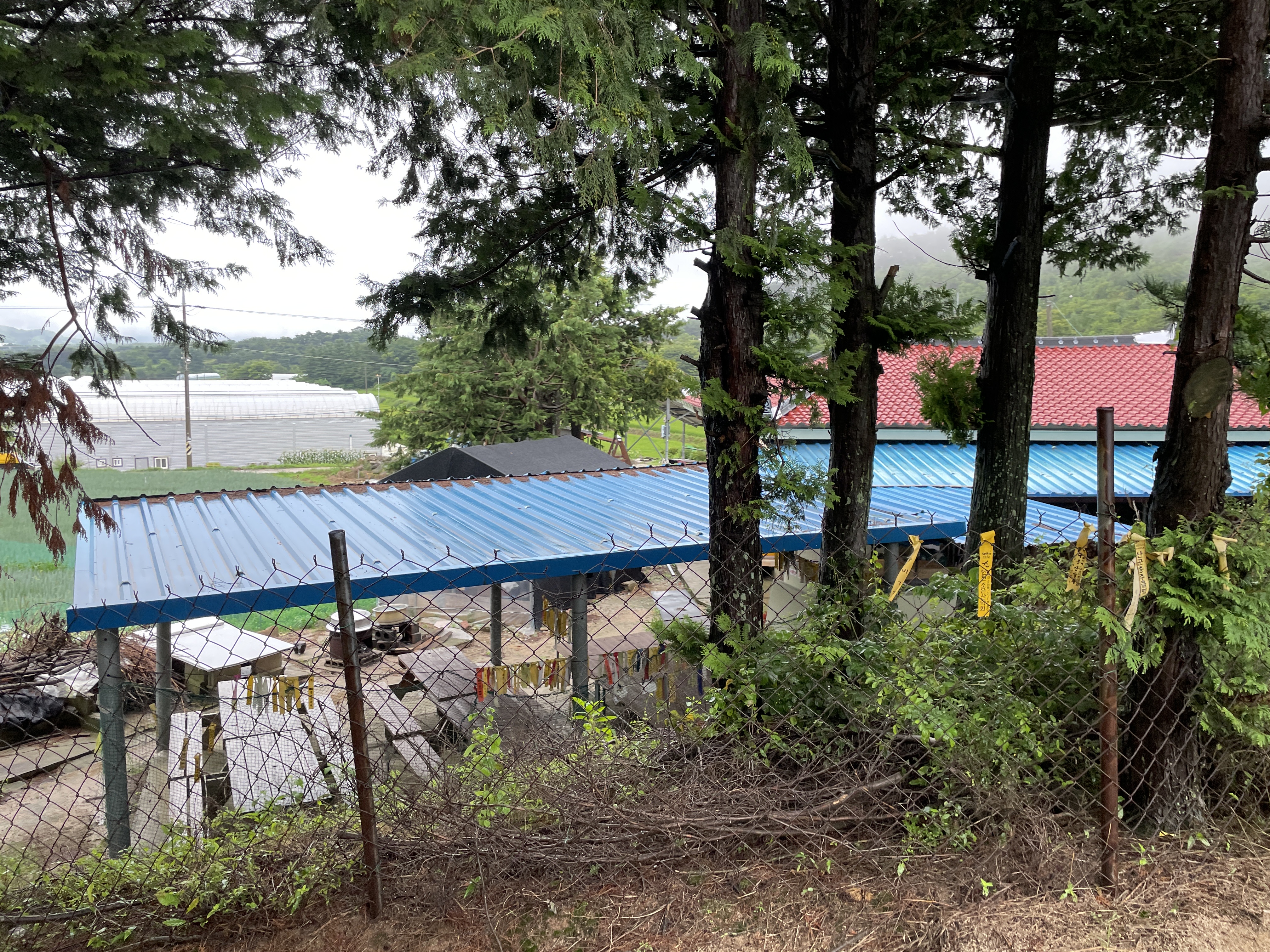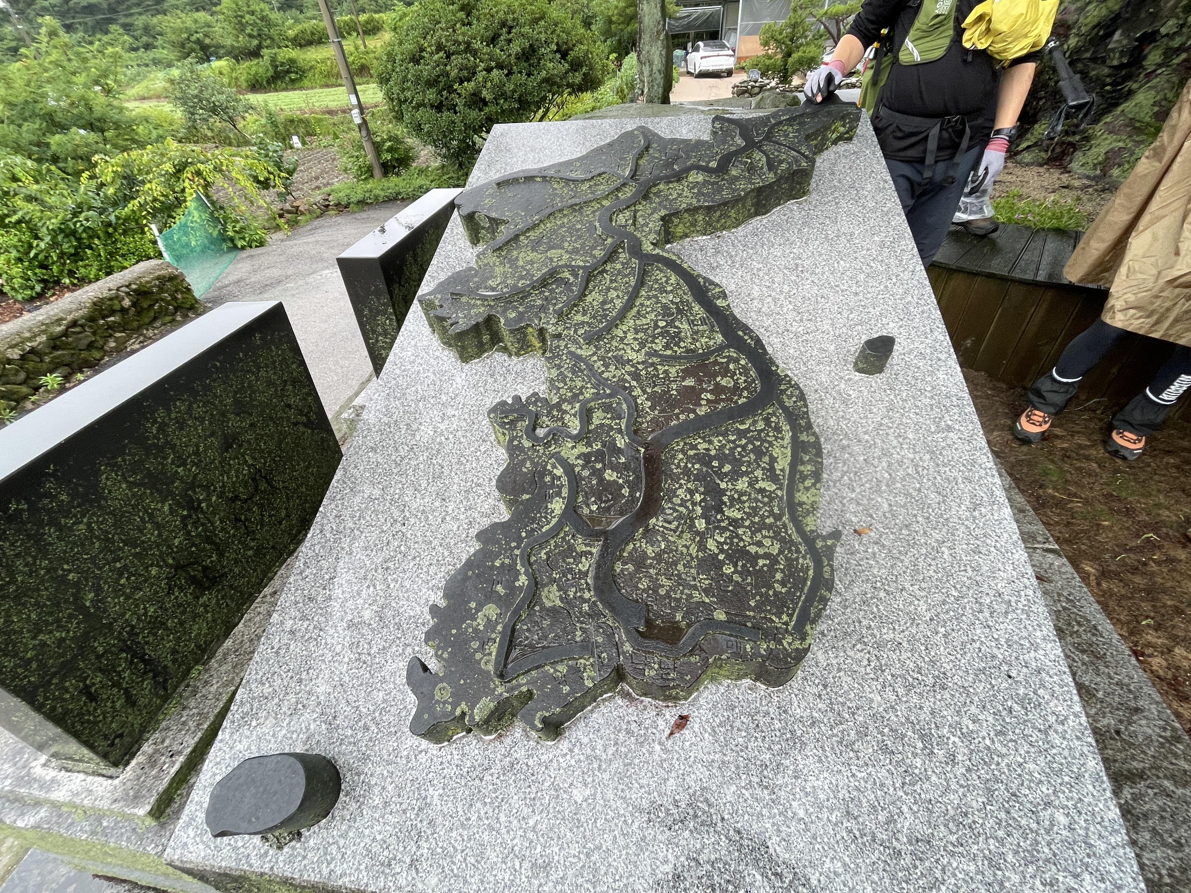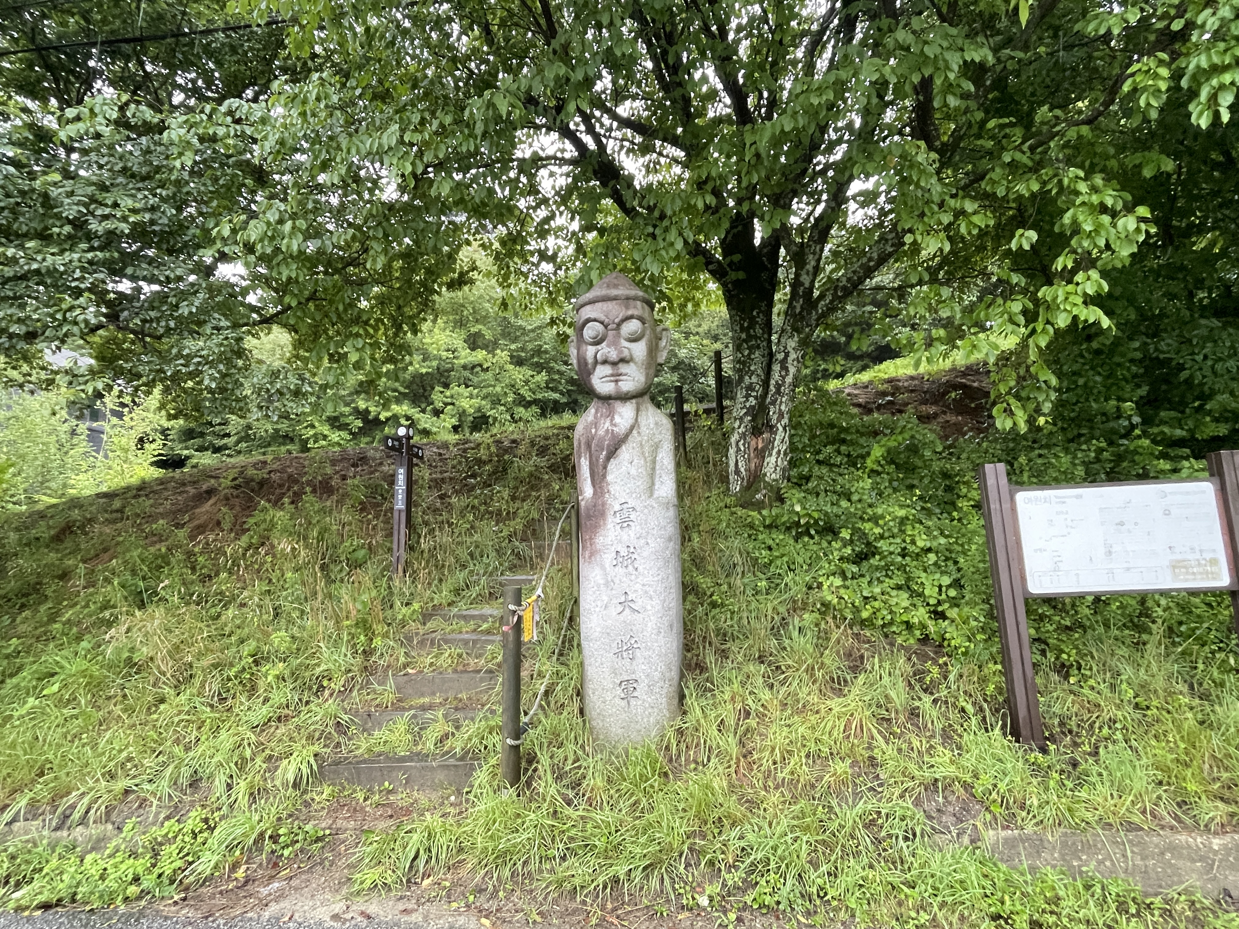 계단을 올라와서 뒤를 돌아보았을 때 풍경, 길을 걷는 동안 천둥번개는 우르르 쾅쾅, 번쩍번쩍 심하게 많이 쳤는데 우리가 가는 백두대간길에는 우비를 벗어도 될 정도의 가끔 나무에서 떨어지듯 내려서 길은 질척였지만 산행을 하는데 불편하지 않았다.