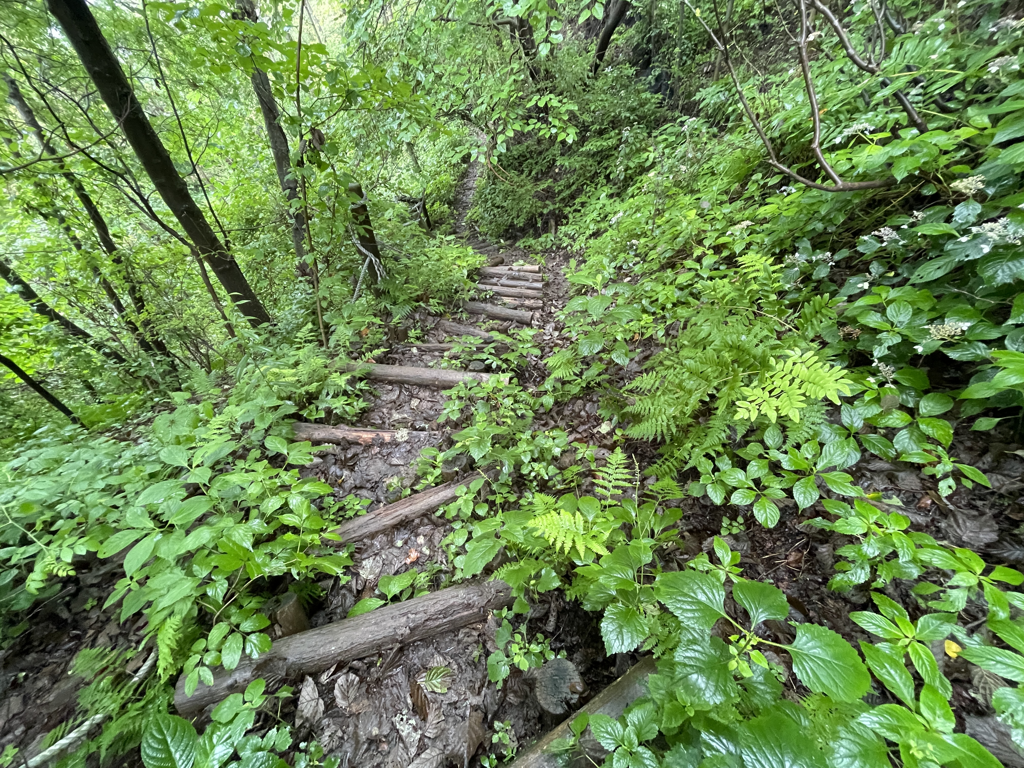 비가 오는 날 백두대간길은 매우 위험하다. 비로 인해 땅이 물러진데 나무로 만든 계단은 특히 더 위험하다.