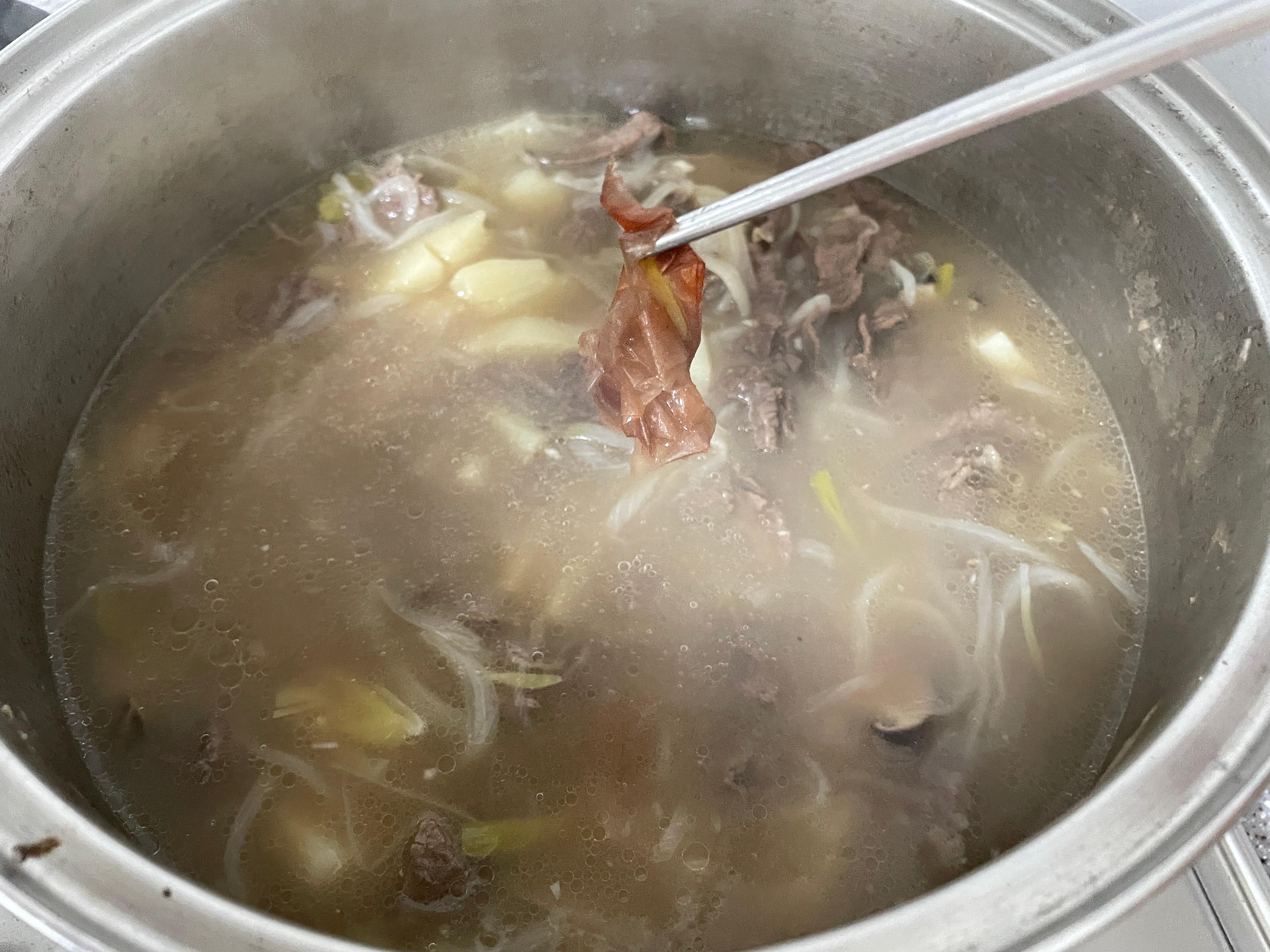 3. 소고기, 양파, 감자가 익은 후 양파껍질도 넣고 표고버섯과 다진 마늘, 파를 넣고 중불에서 끓여줍니다.